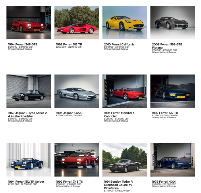 Ferrari 512 TF Spider BMW M1 Jaguar XJ220 Ferrari Dino 246 GTS Ferrari Mondial T Carbriolet Ferrari F430 Jaguar E-Type and a few more…