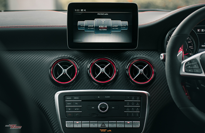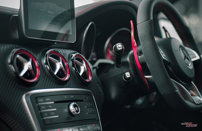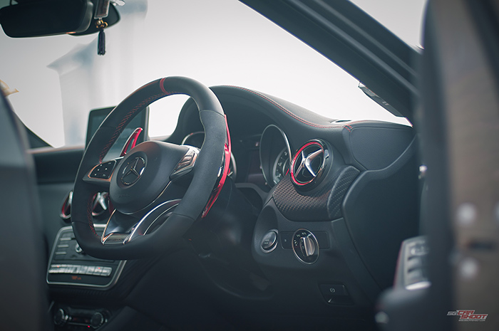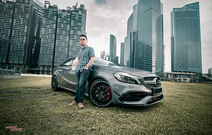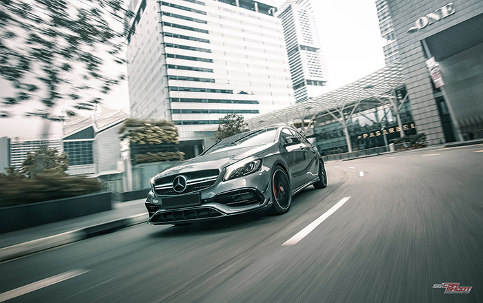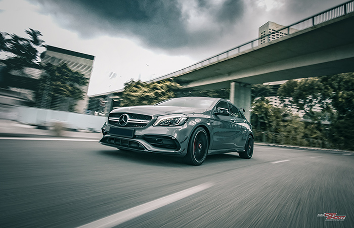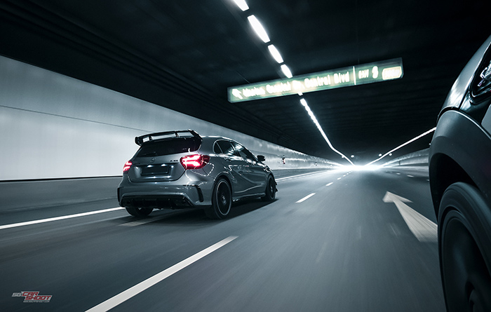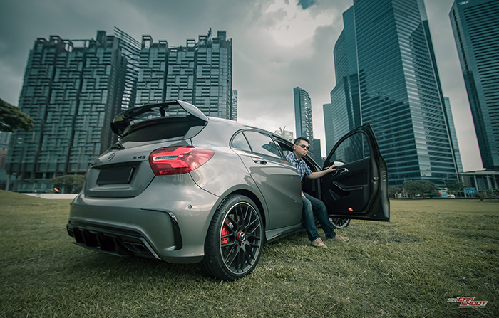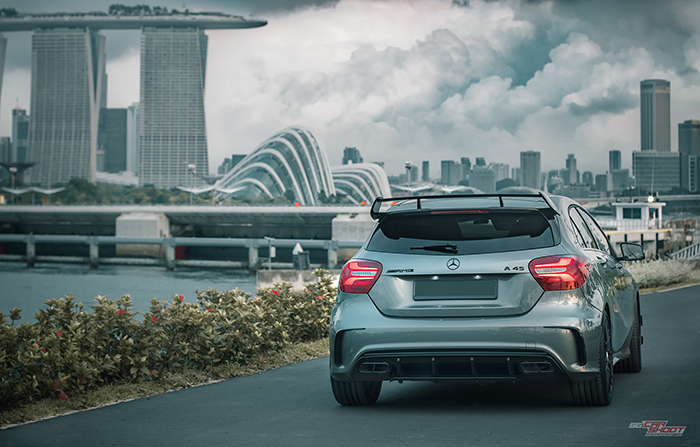 This is the 381bhp engine that underpins Mercedes AMG A45’s position as the world’s most powerful series-produced 4 cylinder road legal car. Hints of fast can be drawn through it’s oversized intakes, canards and diffusers, screaming-red big brake kits, a devilish looking spoiler and twin tailpipes. All these, and still maintaining its svelte body contours of the current Mercedes design language. It would be lovely to shoot this special sports hatchback against Singapore’s beautiful iconic skyline. And we did exactly what we need to.